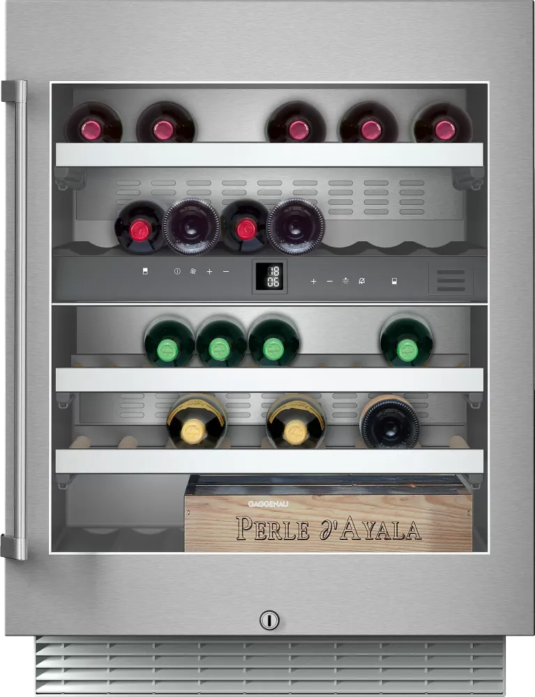 Внутри предусмотрено место для 41 бутылки, которые сохранят свои драгоценные качества благодаря оптимальным условиям хранения. Для белого и красного вина, а также шампанского предусмотрены две раздельные климатические зоны с плавной регулировкой температуры в диапазоне от 5 до 18 °C в каждой. Для поддержания не только правильной температуры, но и необходимого уровня влажности, так важного для сохранения превосходного вкуса, в шкафу работают специальные вентиляторы.