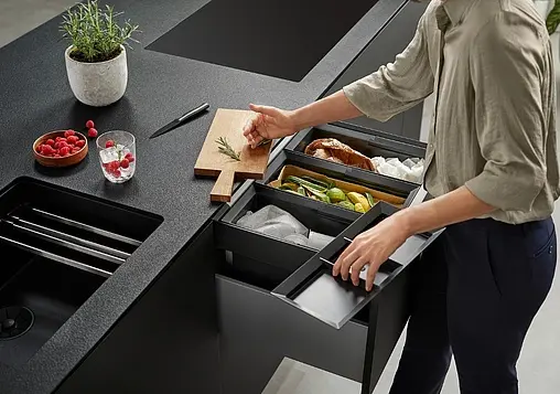 Система сортировки отходов FLEXON II 60/3 Low от Blanco воплощает философию бескомпромиссного качества, инновационного дизайна и функциональности, превращая самое активное место на кухне в продуманный, эргономичный и эстетичный центр для приготовления пищи.