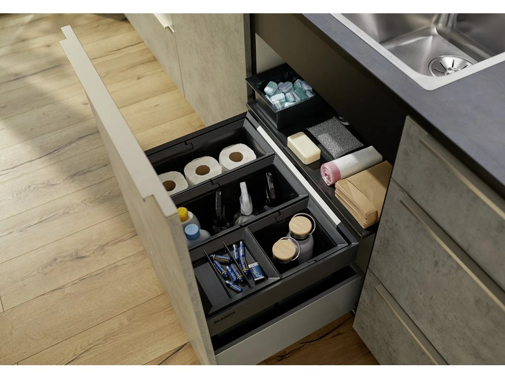 Система сортировки отходов FLEXON II LOW 60/4 от Blanco воплощает философию бескомпромиссного качества, инновационного дизайна и функциональности, превращая самое активное место на кухне в продуманный, эргономичный и эстетичный центр для приготовления пищи.