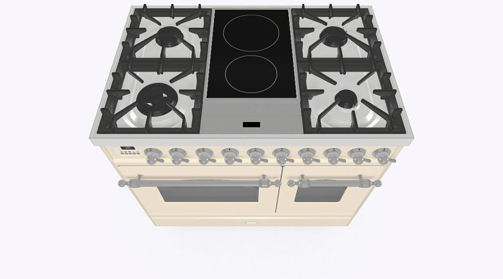4 газовых, 2 индукционные варочные зоны, двухконторная конфорка DUAL