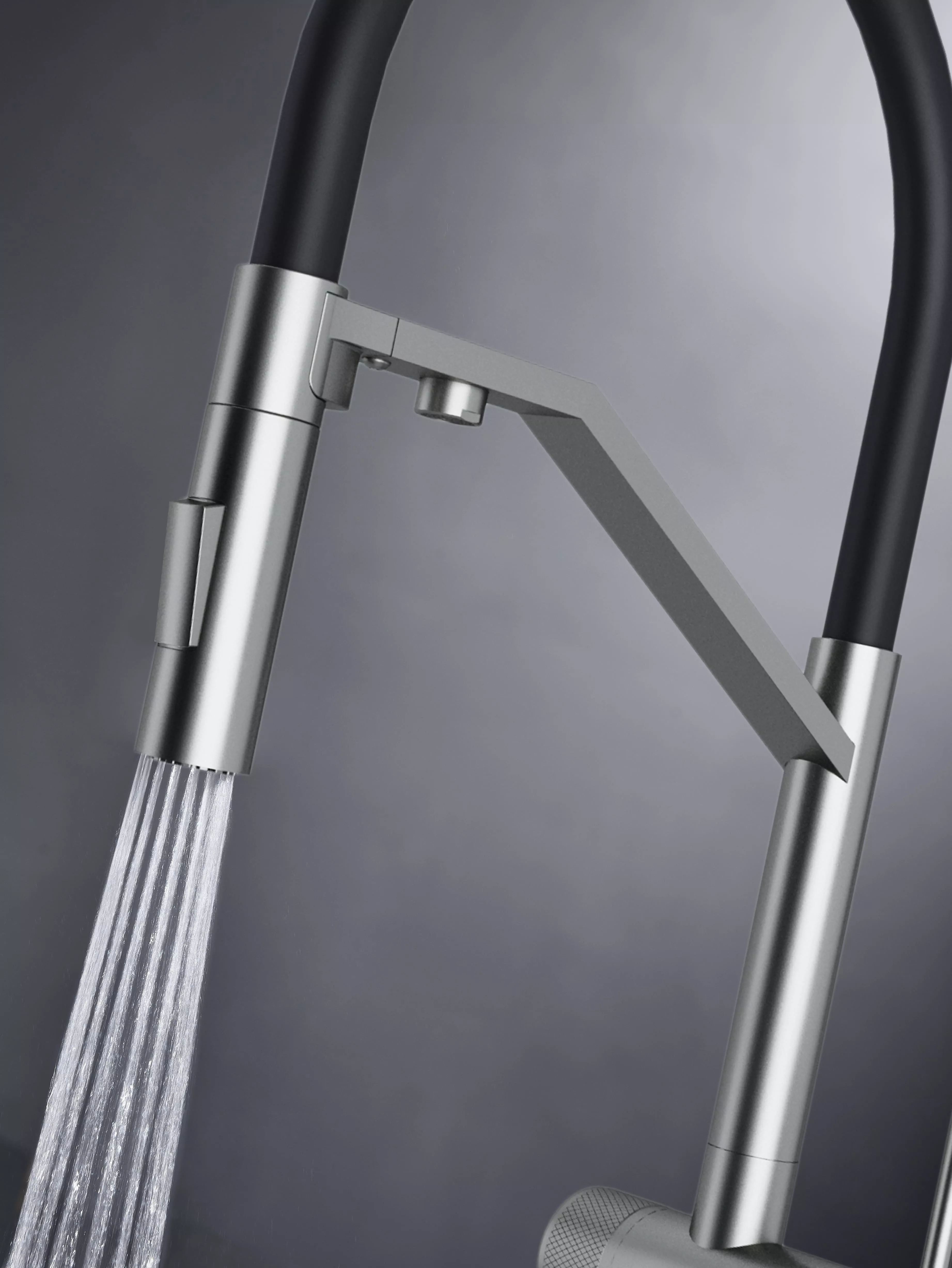 Многофункциональный смеситель для кухни ZENDER оснащен функциями подключения фильтра питьевой воды и гибким силиконовым изливом с двумя режимами подачи водопроводной воды: струя и душ. Для переключения между этими режимами предусмотрена удобная кнопка на конце излива. Управление подачей очищенной питьевой воды осуществляется поворотом специальной ручки, расположенной слева и имеющей декоративные лазерные насечки, при этом вода подается через отдельный аэратор.